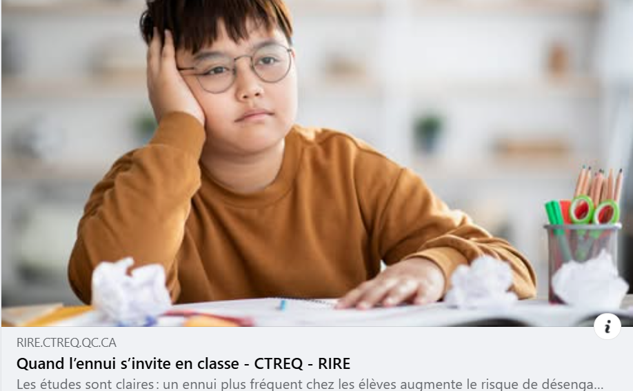 Dans la foulée des articles rédigés en lien avec le colloque sur les émotions à l’école du 𝗖𝗘𝗔𝗣 𝗨𝗤𝗔𝗠 (congrès de l’Acfas 2024), un article intitulé « 𝗤𝘂𝗮𝗻𝗱 𝗹’𝗲𝗻𝗻𝘂𝗶 𝘀’𝗶𝗻𝘃𝗶𝘁𝗲 𝗲𝗻 𝗰𝗹𝗮𝘀𝘀𝗲 » a été publié le 20 mars dernier sur le site du RIRE, une ressource du CTREQ.