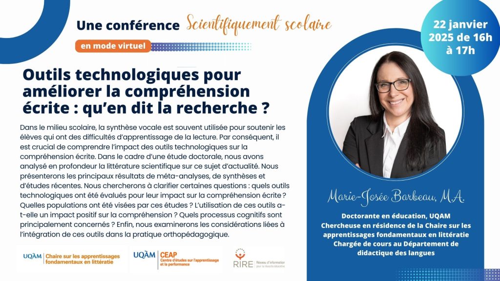 La Chaire sur les apprentissages fondamentaux en littératie et le Centre d’études sur l’apprentissage et la performance (CEAP UQAM) vous invitent à la conférence en ligne Outils technologiques pour améliorer la compréhension écrite : qu’en dit la recherche ? . Cette conférence sera donnée par Marie-Josée Barbeau, doctorante en éducation à l’UQAM, chercheuse en résidence de la Chaire sur les apprentissages fondamentaux en littératie et chargée de cours au Département de didactique des langues. La conférence aura lieu le mercredi 22 janvier prochain de 16 h à 17 h.