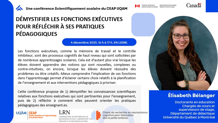 Le CEAP UQAM vous invite à la conférence en ligne Démystifier les fonctions exécutives pour réfléchir à ses pratiques pédagogiques, par Élisabeth Bélanger, qui aura lieu le jeudi 4 décembre prochain de 16h à 17h en ligne.
