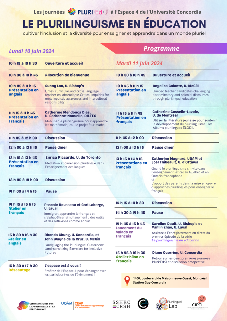 Les inscriptions pour assister EN LIGNE aux Journées sur le plurilinguisme en éducation, organisées par le Centre d’études sur l’apprentissage et la performance (CSLP / CEAP et CEAP UQAM) sont maintenant ouvertes!